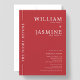 Introducing a sleek and sophisticated rehearsal dinner invitation design, perfect for couples seeking a modern touch. This template features a bold red background that exudes elegance and style. The names are prominently displayed in a classic white serif font, adding a timeless charm to the design.