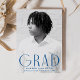 Celebrate your graduate’s accomplishment with this elegant and simple graduation announcement. Featuring a vertical photo of the graduate, the word "Grad" is displayed in bold blue, modern art deco lettering for a chic and contemporary look. Personalize the front of this single-photo graduation announcement by adding the graduate's name, school, and graduation year. The reverse side showcases a stylish blue and white geometric swirl design, adding a touch of sophistication. Ideal for both high school and college graduates, this customizable announcement is the perfect way to share the exciting news with loved ones.