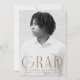 Announce your graduate's achievement in style with this elegant and modern graduation announcement. Featuring the graduate's vertical photo, "Grad" is displayed in antique brass, modern art deco lettering, creating a sophisticated and timeless look. Personalise the front of this single-photo announcement with the graduate's name, school, and graduation year for a custom touch. The reverse side showcases a refined brass and white geometric swirl design, offering a chic contrast. Ideal for both high school and college graduates, this customisable announcement is the perfect way to celebrate and share their special moment.