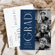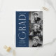 Stylish graduation party invitation postcards featuring the graduate's three photos located to the right of the design in a vertical layout. "Grad" is displayed in white, modern art deco lettering with a navy background. Personalise the modern photo graduation party invite by adding the graduate's name, graduation year, and school name. The postcard reverses to display your return address and graduation party details. Perfect for both high school and college graduations!