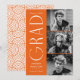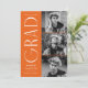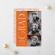 Stylish graduation announcement featuring the graduate's three photos located to the right of the design in a vertical layout. "Grad" is displayed in white, modern art deco lettering with an orange background. Personalise the modern photo graduation announcement by adding the graduate's name, graduation year, and school name. The design reverses to display an orange and white geometric swirl background. Perfect for both high school and college graduations!