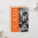 Trendy graduation party invites featuring the graduate's three photos located to the right of the design in a vertical layout. "Grad" is displayed in white, modern art deco lettering with an orange background. Personalize the modern photo graduation party invite by adding the graduate's name, graduation year, and school name. The design reverses to display your graduation party details with an orange and white geometric swirl background. Perfect for both high school and college graduations!