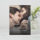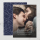 Modern holiday card featuring your customisable phrase inside of a modern white outline. Your photo is displayed behind. The gradient overlay helps the white text to show up on lighter photos and can be deleted or repositioned, if desired. The back features a blue and white modern geometric pattern.