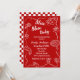 This playful and appetizing design bursts with fun energy on a vibrant red background, featuring whimsical white line art doodles of pizza slices dripping cheese, a margherita pizza, pizza paddle, maracas, mushrooms, tomatoes on the vine, a teddy bear, and a baby bottle for a cheeky food-meets-baby twist. 🍕🍼 The hand-drawn style adds a lively, hand-sketched charm with swirling vines and bouncy elements, creating a joyful, celebratory vibe full of humor and delicious anticipation perfect for a girl's lively shower. ✨