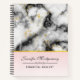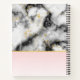 Spiral notebook with an elegant and modern marbled pattern. White, black and smoky grey marble with thin ribbons of faux-gold swirls throughout the pattern. A light pink gradient background beneath the marbled pattern.