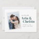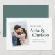 A casual and modern save the date design featuring a vertical photo with a white snapshot border, placed diagonally with your wedding details alongside in spruce green modern serif and grey handwritten script lettering.