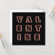 Greet your Valentine with modern minimalist style, with this eye-catching card. The contemporary card displays the word Valentine, divided onto three lines, in red and white, contrasting with the black background. The typography is geometric and angular, with a sleek, space age appearance. The reverse side of the card is plain white for your own individual message. With its stand-out modern look and bold design, this is a Valentine's Day card for maximum impact.