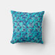 Mid-Century Modern abstract throw pillow of squared spirals in aqua, cobalt blue, and dark navy / indigo, accented with white