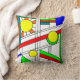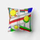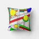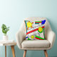 This throw pillow has a mid-century modern design of a stained-glass look with black lines and circles filled with primary and secondary colours.