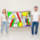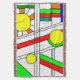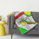 This throw blanket has a mid-century modern design of a stained-glass look with black lines and circles filled with primary and secondary colours.