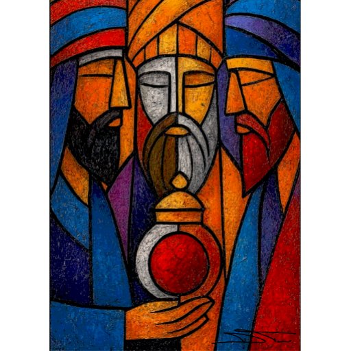 Celebrate the spirit of Epiphany with this striking stained glass-style artwork featuring the Three Wise Men. Rendered in bold lines and radiant jewel tones—royal blue, fiery orange, and deep purple—each figure carries symbolic gifts in a modern interpretation of the Nativity story. Perfect for holiday decor, religious gifts, or cultural collections, this design blends sacred tradition with contemporary elegance. Ideal for prints, cards, apparel, and seasonal signage.