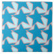 Giant overlapping stars form a Mid-Century Modern geometric tiled pattern - deep cerulean / sea blue stars with a pale sky blue background and a coral pink outline