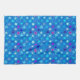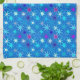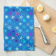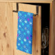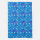 Kitchen towel in a mid-century modern pattern of seven-point, outlined stars, in soft, celestial shades of aqua, turquoise and violet, on a deep cerulean blue background