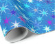 Wrapping paper in a mid-century modern pattern of seven-point, outlined stars, in soft, celestial shades of aqua, turquoise and violet, on a deep cerulean blue background