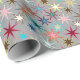 Wrapping paper in a mid-century modern pattern of seven-point, outlined stars, in saturated, jewel colours, on a light silver grey / grey background