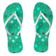 Flip-flops in a mid-century modern pattern of seven-point, outlined stars, in shades of aqua, seafoam green and jade, on a turquoise / peacock background