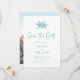 This modern minimal beach wedding save the date card has a white background with aqua blue text, two starfish at the top, and trendy handwriting script calligraphy, with a photo template on the back.