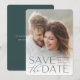 Announce your wedding date in unforgettable style with these elegant and modern photo save the date cards, featuring a full bleed vertical or portrait orientated photo with "save the date" overlaid in forest green lettering along the bottom. Your names, wedding date, and wedding location appear alongside in modern lettering. Personalise the back with additional details, such as your wedding website.