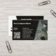 🔀The back side mirrors the design in reverse, covering both left corners with a white trapezoid serving as the background to a custom initial logo in black with a steel blue shadow. The front includes a QR code in the bottom left corner with a call-to-action to "Scan & Enquire!" and a list of 9 service strengths. Above is the prominent display of your Company Name.