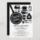Stylish Black & white stock the kitchen wedding shower invitation featuring kitchen tools including a frying pan, hand mixer, kitchen timer, pot, utensils, apron, whisk, measuring cup, pot holder & cups. Visit our shop to view this kitchen shower invite in other colours.