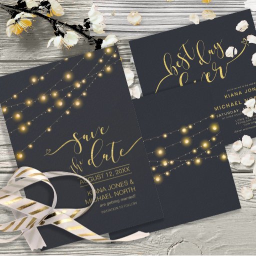 Sparkling gold string lights are the focal point for all the pieces of this simple wedding suite that also features elegant calligraphy and modern design layouts. The arch-shaped acrylic invitation shown here features the above plus optional 'best day ever' text and a template to easily add your event details. Search ID585 to see all the matching pieces in this beautiful wedding set.