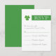 Modern stripe and clover/shamrock St. Patrick's Day Irish green, grey minimal wedding response/reply card that features a green stripe and a shamrock with a water drop in the centre. Text in a vintage style font. This elegant design is fully customisable and is part of a wedding set perfect for an Irish Saint Patrick’s Day wedding.