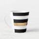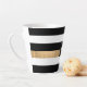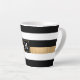 Modern chic latte mug done in a bold black, white and gold tone horizontal stripe pattern. A black and gold square monogram block, on the front of the mug, has a white single letter monogram ready to personalise.