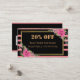 Modern elegant classy black and pastel pink stripes with golden border cute watercolor pink flowers and back side QR code discount business card on pink background. You can easily change all details, fonts, colour, size and background colour,front and back both sides. Replace your own QR code to your website on social media account.