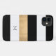 Elegant iPhone 11 case, with a modern bold white, black and gold horizontal striped pattern. Personalise the one letter monogram as a great gift idea.