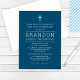 A bold and modern First Holy Communion invitation for a boy featuring a deep navy blue background with a light blue cross and crisp white typography. The child's name is displayed prominently in large bold lettering for a contemporary, striking look. The back features a coordinating navy and white diagonal stripe pattern. All text is fully customisable for your son's ceremony and celebration.