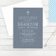This stylish First Holy Communion invitation for a boy features a sophisticated slate blue grey background with a lighter blue cross and clean white typography. The child's name appears in bold, modern lettering as the focal point of the design. A coordinating slate blue and white diagonal stripe pattern dresses up the back. Fully customisable for your son's special celebration.
