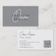 This sophisticated and stylish business card design features a modern grey and white colour scheme with an elegant mix of serif and script typography. The front showcases a distinctive overlapping text layout, where the bold uppercase business name is complemented by a flowing handwritten accent, creating a refined and artistic look. The back maintains a clean and professional design with essential contact details, a QR code for instant digital access, and social media icons for a contemporary touch. Perfect for entrepreneurs, designers, and creative professionals, this customisable design exudes elegance and professionalism while making a lasting impression.