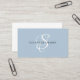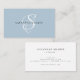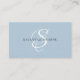 The trendy, stylish monogram business card design features your initial in a gorgeous calligraphy script with flourishes that wrap around your name. On the back is space for your professional title, contact info, social media, and your website address. This version is in the dusty blush blue and black/white combination.