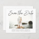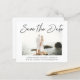 Budget Save the Date cards with modern handwritten script text. Completely versatile do-it-yourself style layout. The script text is flat image that cannot be edited, but it can be moved, resized, or rotated to align perfectly with the photo in advanced Customise mode. All other text elements can be fully edited.