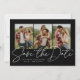 With three vertical photos and a modern script written "save the date," this card is the perfect way to announce your engagement and upcoming wedding to friends and family. The chic white text is bold and modern but still sophisticated. The customisable text on the front has room for names, date, location and other information like a wedding website. The back is a matching black and white striped pattern. The colour is editable by clicking "Customise."