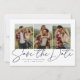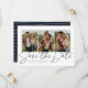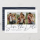 With three vertical photos and a modern script written "save the date," this card is the perfect way to announce your engagement and upcoming wedding to friends and family. The chic navy blue text is bold and modern but still sophisticated. The customisable text on the front has room for names, date, location and other information like a wedding website. The back is a matching navy and white striped pattern. The colour is editable by clicking "Customise."