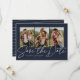 With three vertical photos and a modern script written "save the date," this card is the perfect way to announce your engagement and upcoming wedding to friends and family. The chic white text is bold and modern but still sophisticated. The customisable text on the front has room for names, date, location and other information like a wedding website. The back is a matching navy and white striped pattern. The colour is editable by clicking "Customise."