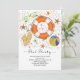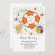Contemporary pool party invitation featuring an orange & white inner tube with flip flops, beach ball & sunglasses set on a sand dotted background with starfish.