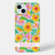 Customize this gorgeous modern sunflowers with pink zinnias painting iPhone 15 pro max case with your your name in a trendy modern CAP font in pink on white. It's so beautiful and happy!