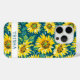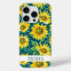 Customize this colorful modern sunflowers on teal painting iPhone 15 pro case with your your name in a trendy modern CAP font in teal on white. It's so beautiful and happy!
