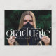 This modern graduation announcement postcard features a the word graduate in a trendy serif font with swirling accents creating an elevated, luxury feel. This graduate text sits atop a full page photograph, highlighting the graduate. The graduate's name, school, and graduating class year are integrated with the graduate text, making this unique graduation announcement sure to be a hit. The back is setup as postcard — add a postcard postage stamp and it's ready to mail!