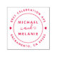 This modern wedding self-inking stamp design features "and" in a handwritten font with swirls along with the couple's names and round return address in a sans-serif font with two hearts on the sides.