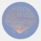 This design was created using watercolor, ink, and digital editing. The various tan and sandy hues on the scallop shell give it depth and a beachy feel. The dark blue background makes the light shell pop off the page. And nicely complements the peachy and tan hues of the seashell.