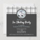 The design features a pair of ice skates over a snowflake crest and an off-white tartan pattern background. This elegant winter sports design serves as cute modern and unique birthday or Christmas party invitations.