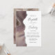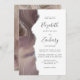 The left-hand edge of this elegant modern wedding invitation features a taupe watercolor agate border trimmed with faux silver glitter. The customisable text combines handwriting, copperplate and italic fonts in charcoal grey on a white background. The reverse side features a matching taupe and silver agate design.