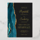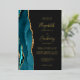 The left-hand edge of this elegant modern wedding invitation features a teal blue watercolor agate border trimmed with faux gold glitter. The customisable text combines handwriting, copperplate and italic fonts in real gold foil on a dark background. The reverse side features a matching teal and gold agate design.