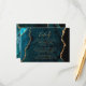 This elegant modern wedding details enclosure card features a background image of teal blue watercolor agate trimmed with faux gold glitter. The title appears in gold-coloured handwriting script, with customisable text below in copperplate font. The reverse side features a matching teal blue and gold agate design.