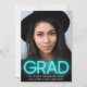Fun, trendy graduation announcement with "GRAD" in bright light teal blue neon typography overlaying the graduate's photo. Personalise with his or her name, class year and school.