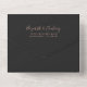 The left-hand edge of this elegant modern all-in-one wedding invitation and RSVP features a teal blue watercolor agate border trimmed with faux rose gold glitter. The customizable text combines dusty rose handwriting, copperplate and italic fonts on a dark off-black background. The return address appears on the outside flap and the reverse side of the detachable RSVP card.