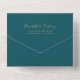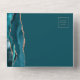 The left-hand edge of this elegant modern all-in-one wedding invitation and RSVP features a teal blue watercolor agate border trimmed with faux rose gold glitter. The customizable text combines dusty rose handwriting, copperplate and italic fonts on a teal blue background. The return address appears on the outside flap and the reverse side of the detachable RSVP card.